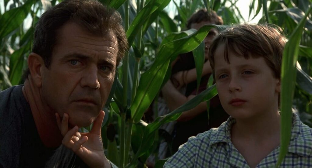O ponto de partida da história é deliberadamente doméstico. Graham Hess, interpretado por Mel Gibson, é um ex-pastor episcopal que perdeu a fé após a morte acidental da esposa. Ele vive com o irmão Merrill, vivido por Joaquin Phoenix, e os dois filhos pequenos, Morgan e Bo, em uma fazenda na Pensilvânia. É uma família marcada por ausência e silêncio.